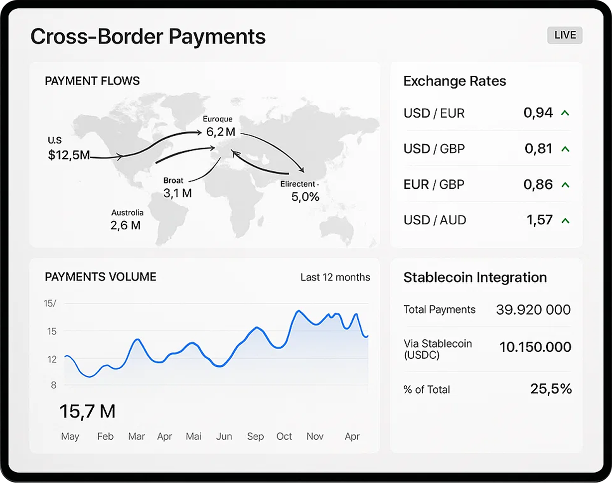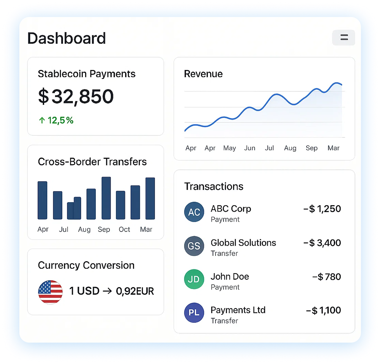Integrate stablecoins into payment flows, enabling instant cross-border settlements, low costs, and real-time access to global liquidity.