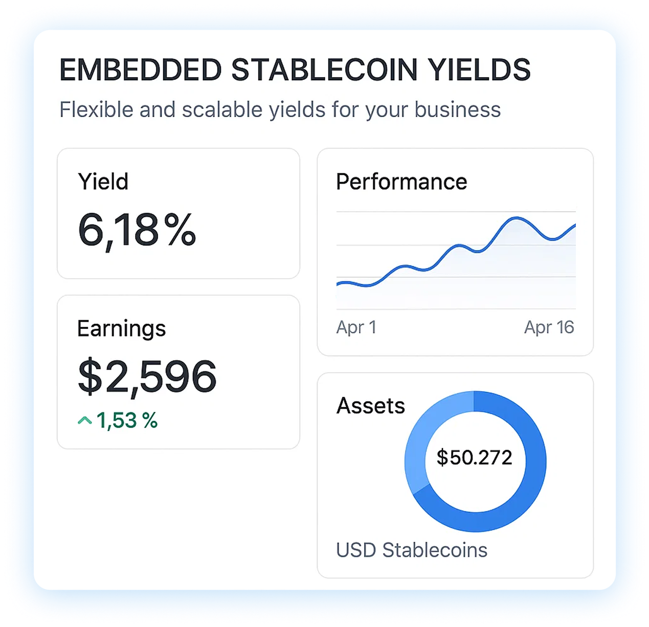 Design compliant, scalable stablecoin yield products for next-gen finance. Configure fees for extra revenue, monitor performance, and track yields seamlessly.